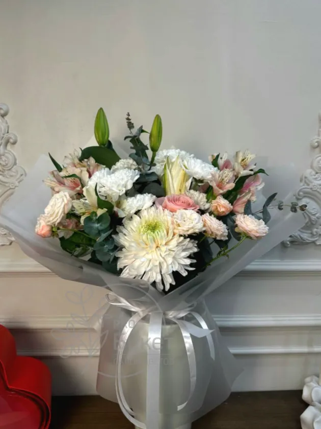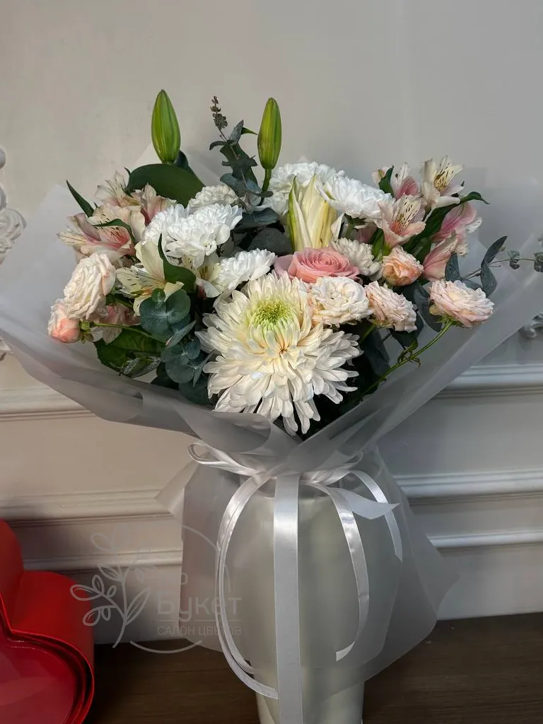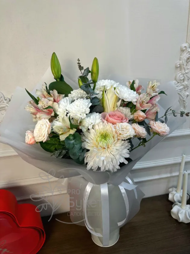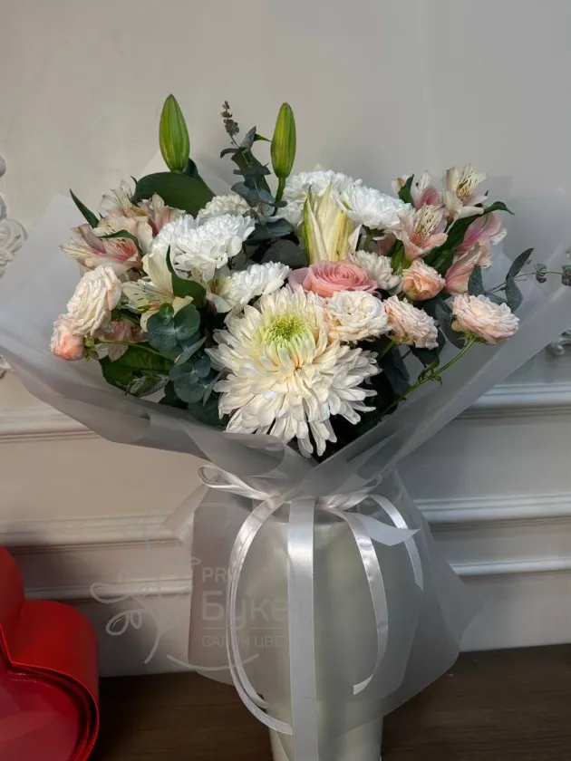 Нежный букет, созданный из белых и бледно-розовых роз, лилий, хризантем и альстромерий , станет прекрасным выражением любви и заботы. Воздушная упаковка и нежные оттенки цветов придают композиции особую элегантность и романтичность. Этот букет идеально подойдет для любого торжества или просто для того, чтобы сделать приятный сюрприз.