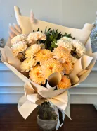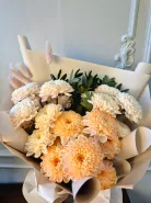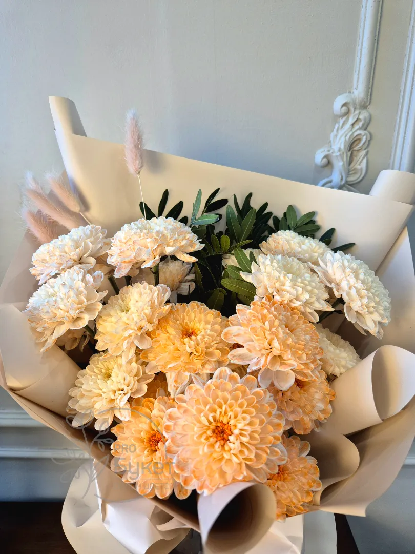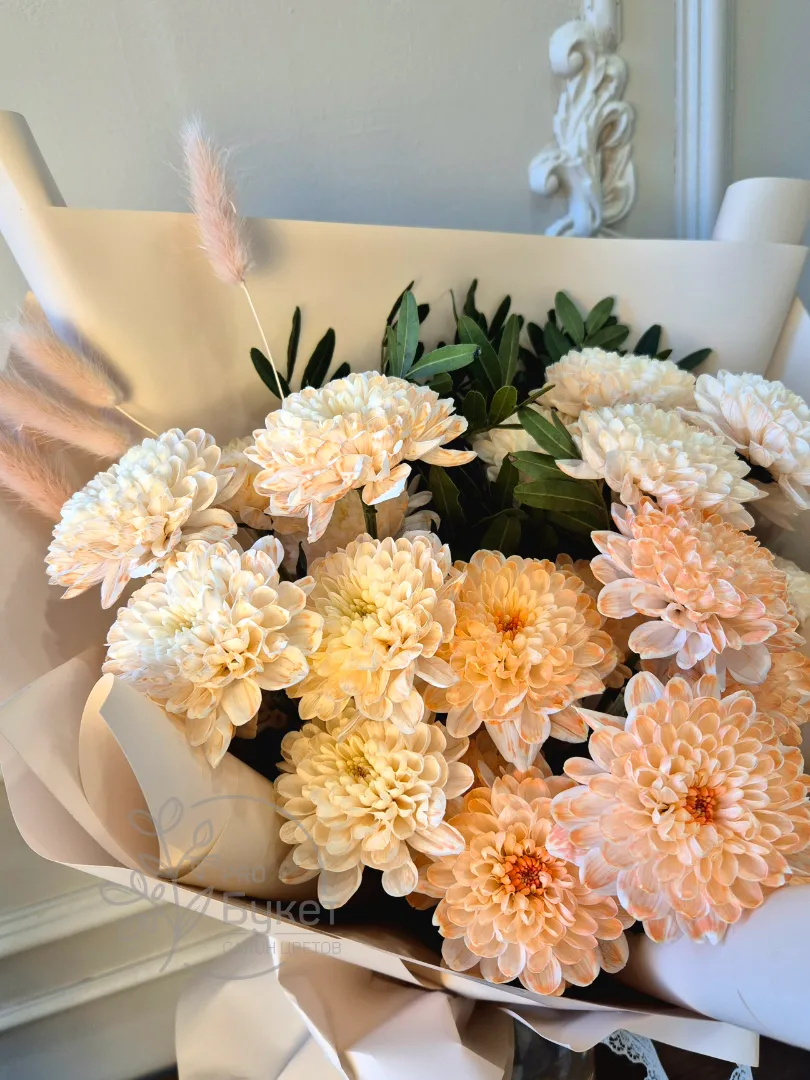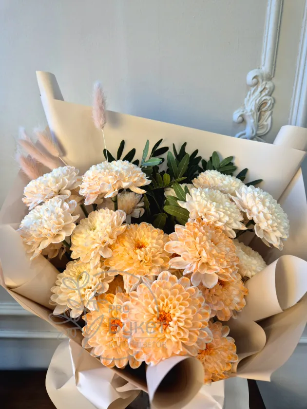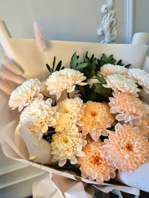 Букет из нежных кремовых хризантем, дополненный элегантными веточками лагуруса и зеленью фисташки, создает уютную и романтичную атмосферу. Этот букет идеально подходит для тех, кто ценит сдержанную красоту и тепло.