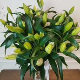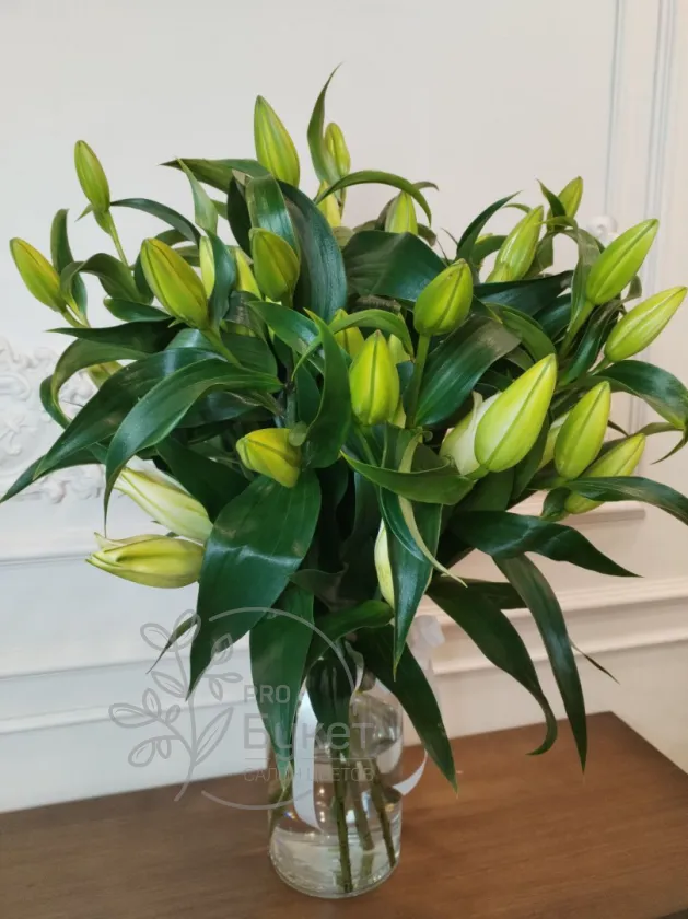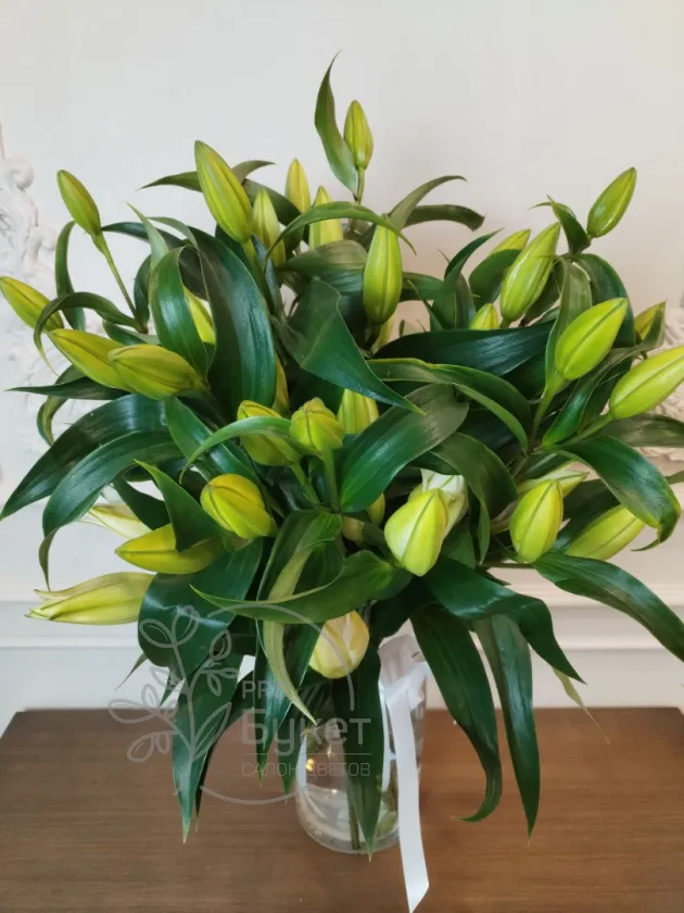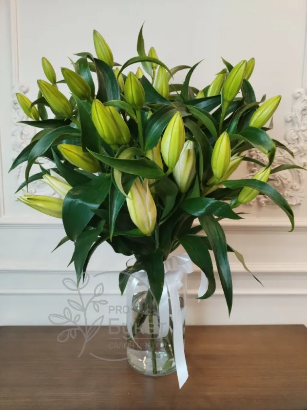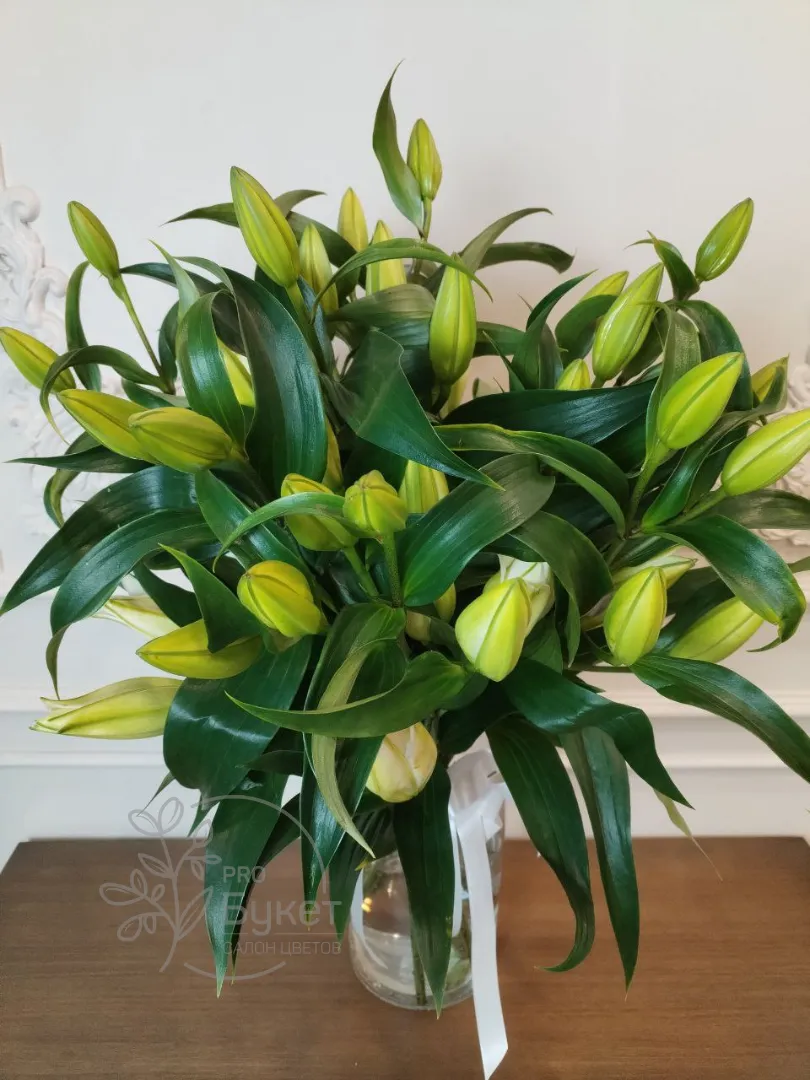 «Элегантный букет из бутонов лилий в нежно-зеленых оттенках, символизирующий чистоту и обновление. Свежие цветы в прозрачной вазе с белой лентой добавят изысканности любому интерьеру. Идеальный выбор для тех, кто ценит сдержанную красоту и свежесть.»