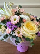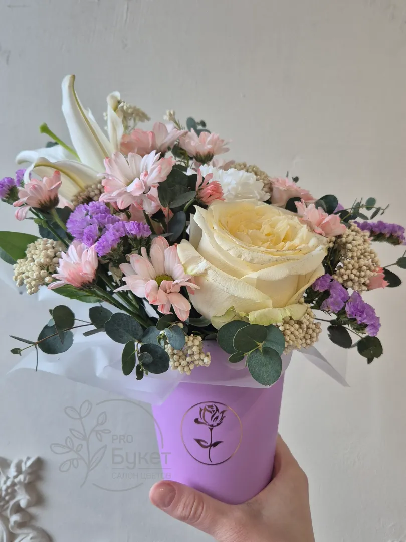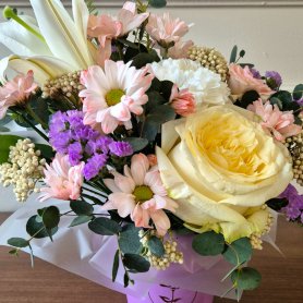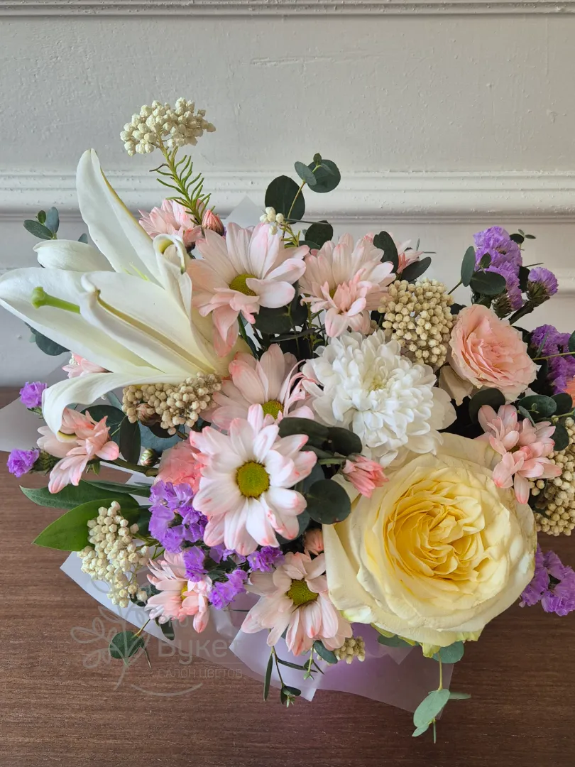 Нежный букет в пастельных тонах, состоящий из белой лилии, розовых хризантем, фиолетовой статицы и крупной кремовой розы, создает элегантную и трогательную композицию.