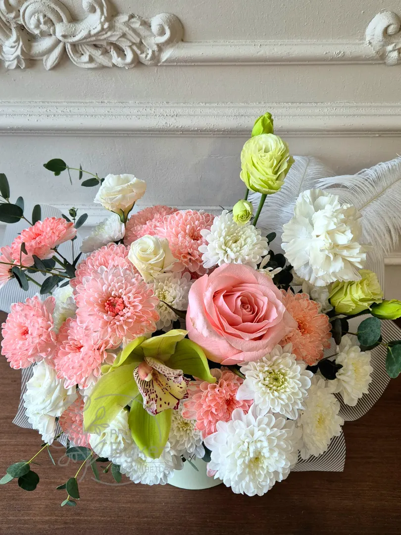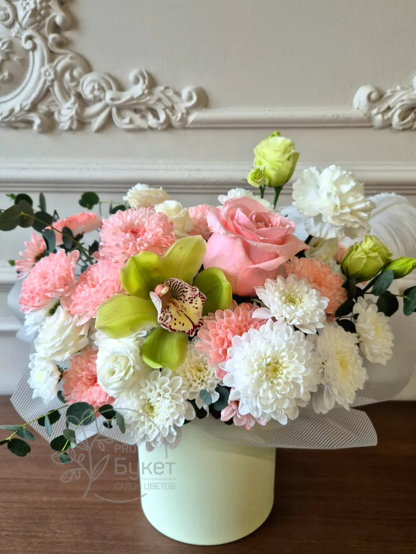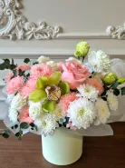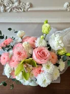 Нежная и элегантная композиция из белых и розовых цветов, дополненная свежей зеленью. В ее состав входят розы, гвоздики, хризантемы и орхидеи, создающие объемную и воздушную структуру. Эта композиция идеально подойдёт для подарка или украшения интерьера.
