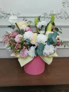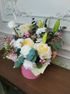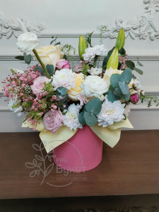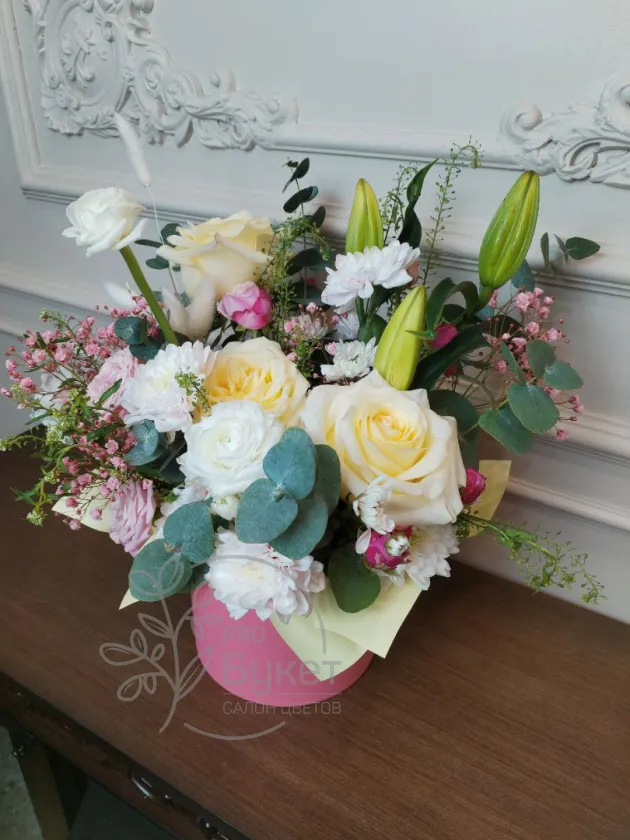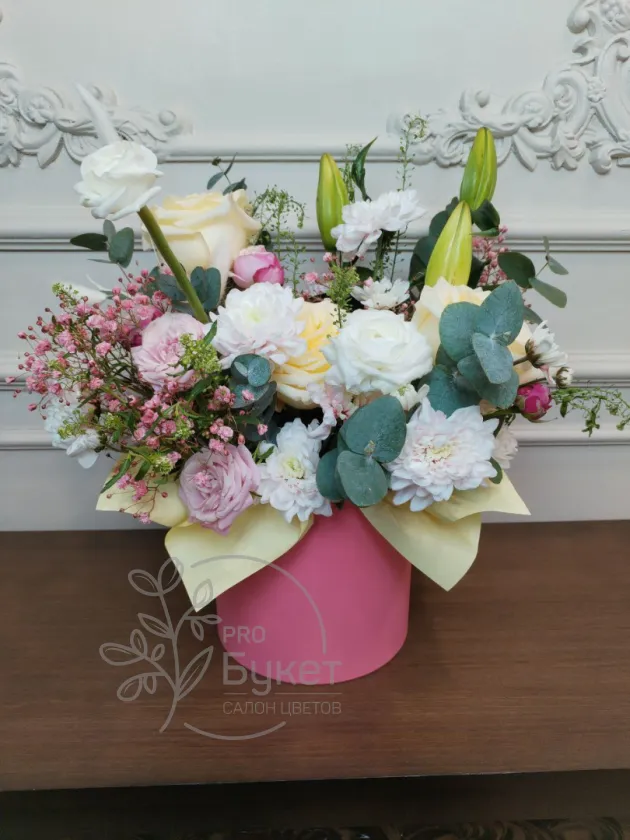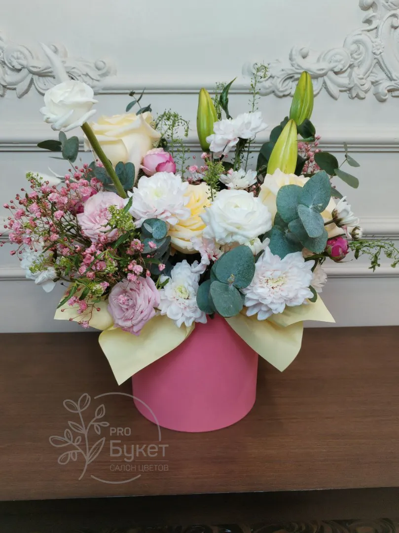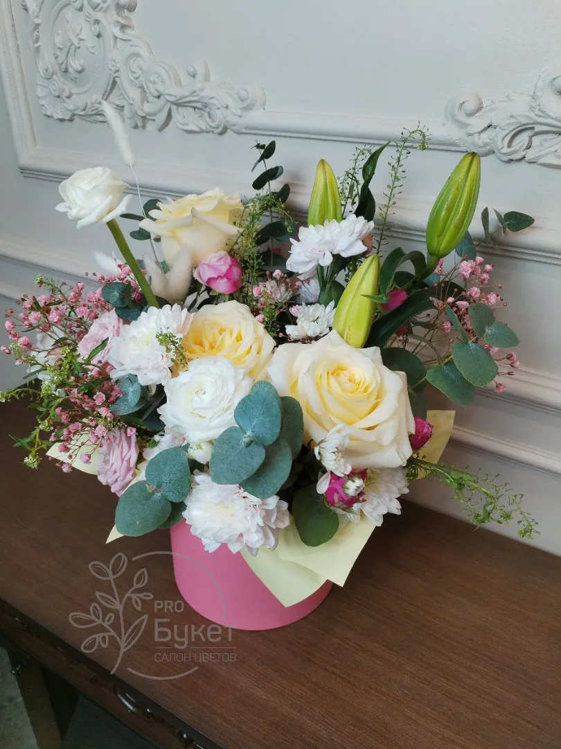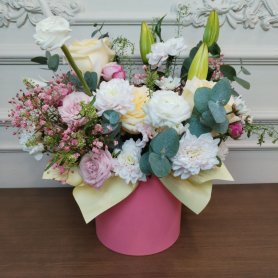 Букет в розовой коробке, наполненный нежными белыми и розовыми розами, ранункулюсами и лилиями, дополненный воздушной гипсофилой и зеленью эвкалипта.