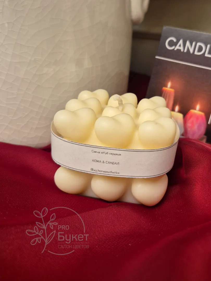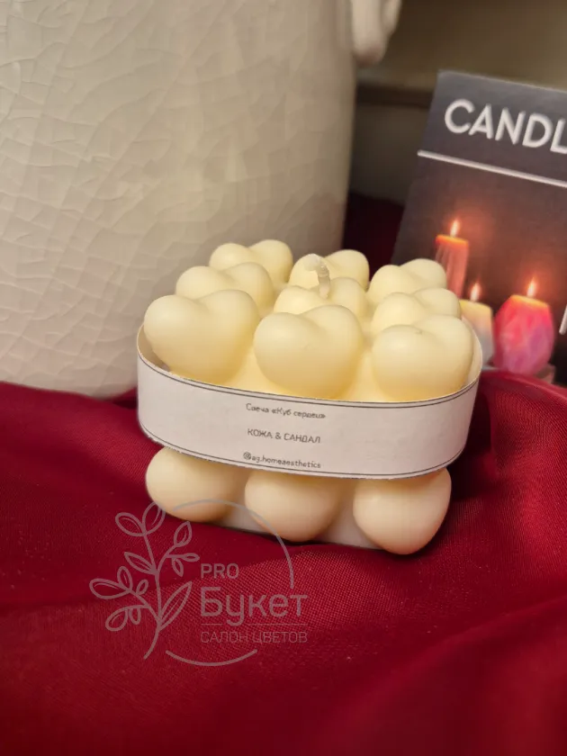 Свеча из 100% соевого воска «Куб сердец» с ароматом «Кожа и сандал». Высота - 5,5 см