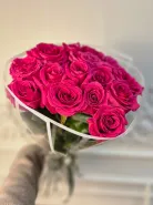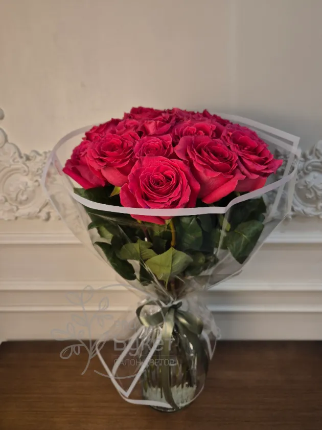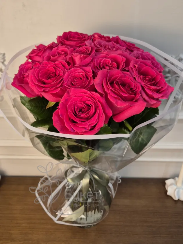 Букет из 15 роскошных роз глубокого малинового цвета, элегантно оформленный в прозрачной упаковке с белой лентой. Нежные лепестки и насыщенный цвет создают выразительный образ, идеально подходящий для особенного подарка. Этот букет станет ярким выражением внимания и любви.