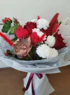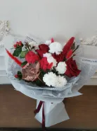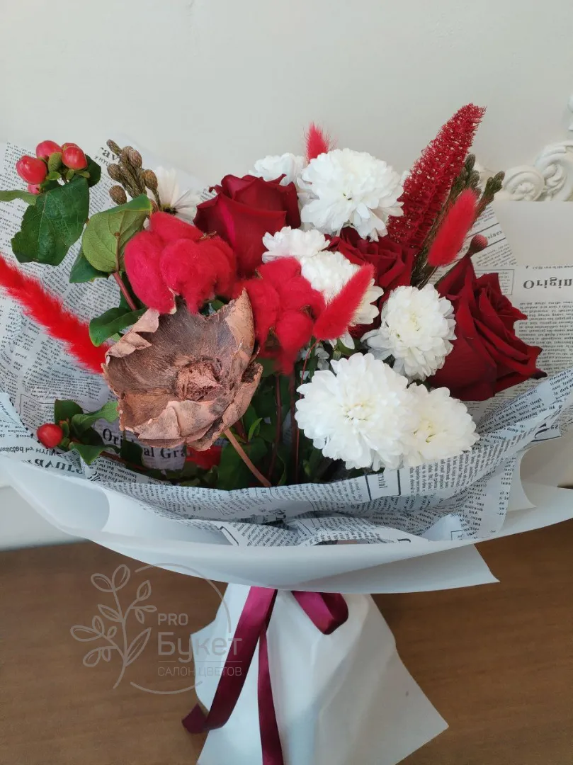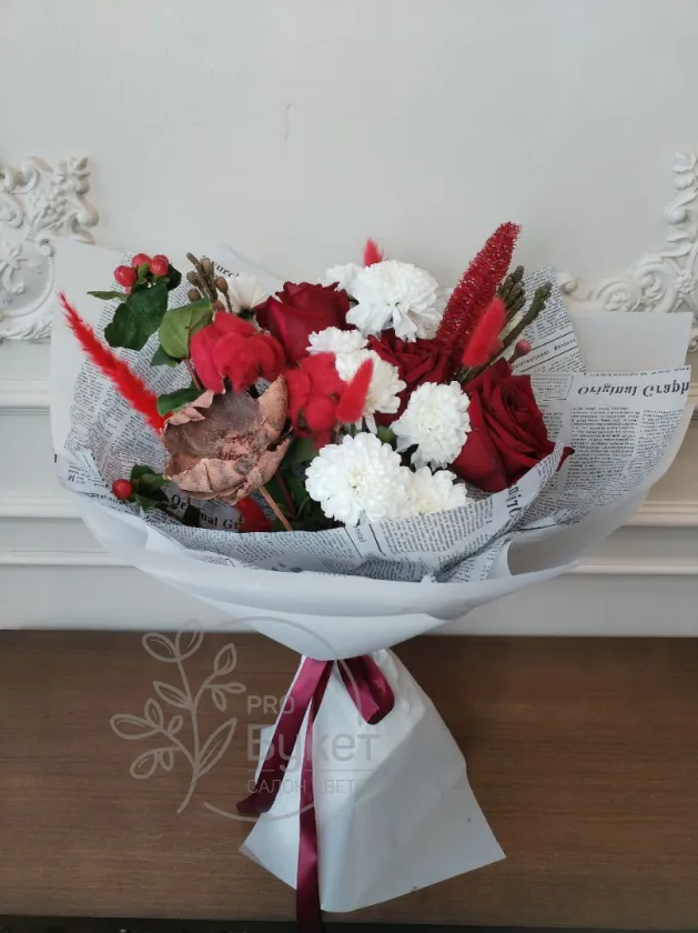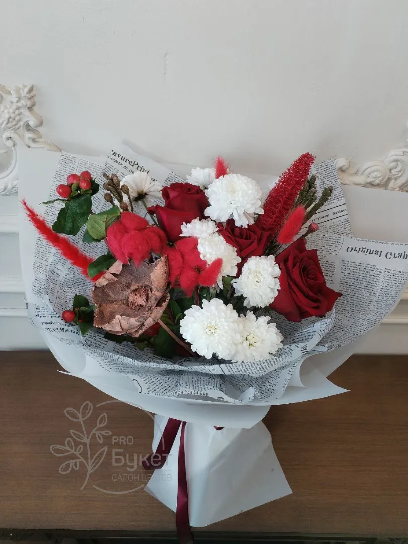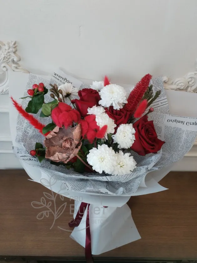 Элегантная композиция из красных и белых цветов, деликатно обернутая в бумагу с текстовым узором. В букете гармонично сочетаются красные розы, белые хризантемы, и другие декоративные элементы, что придает ему пышный и праздничный вид.