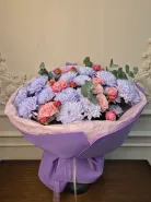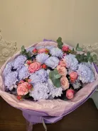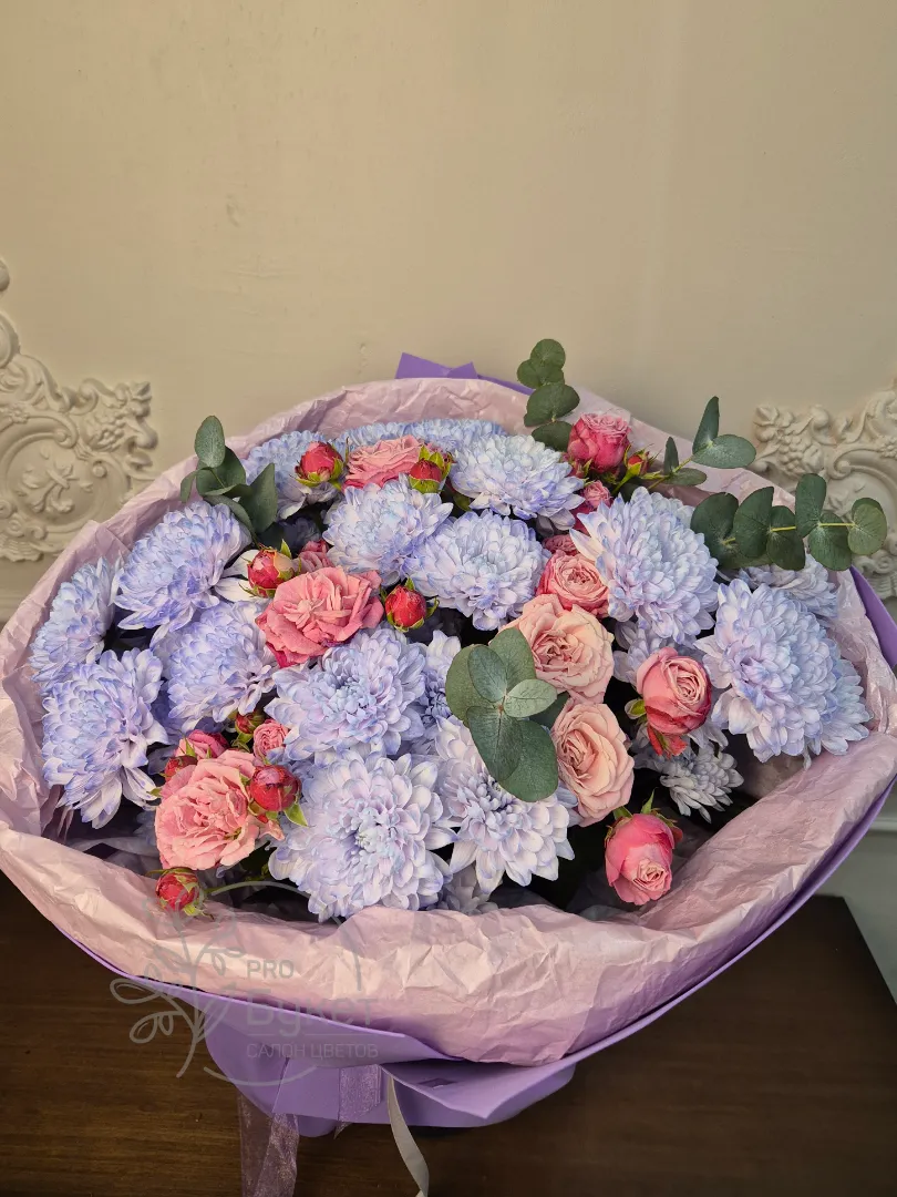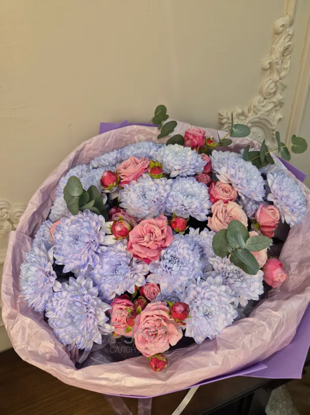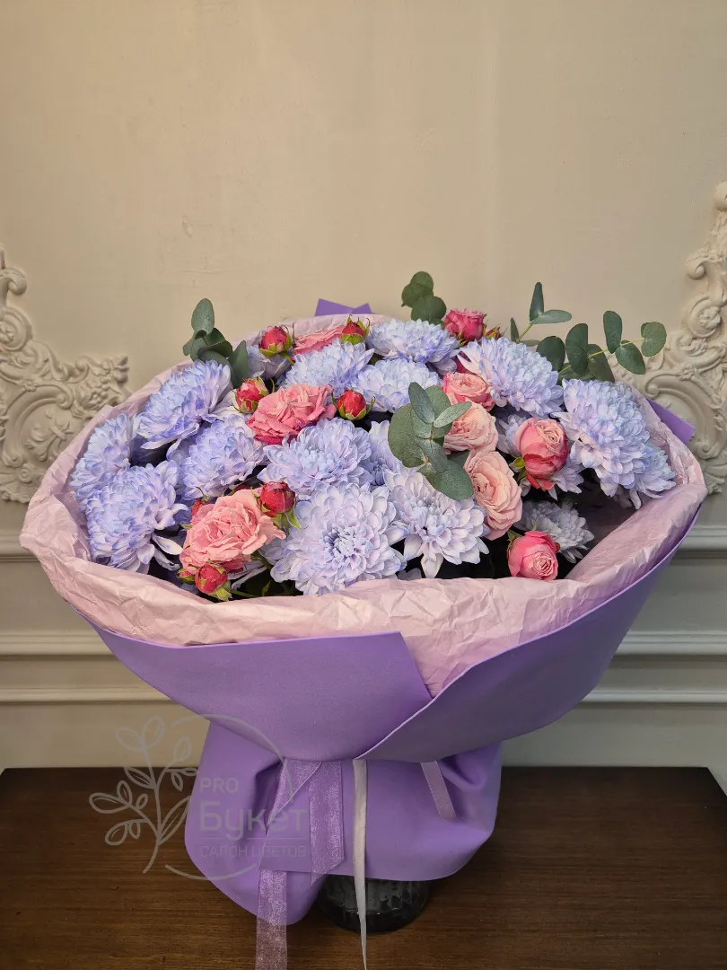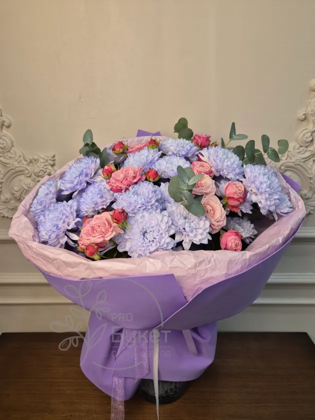 Элегантный букет из розовых роз и лавандовых хризанте , дополненный изумрудной эвкалиптовой ветвью, облачен в легкую фиолетовую упаковку. Нежные оттенки цветов создают атмосферу воздушности и романтики. Этот букет идеально подойдет для создания праздничного настроения.