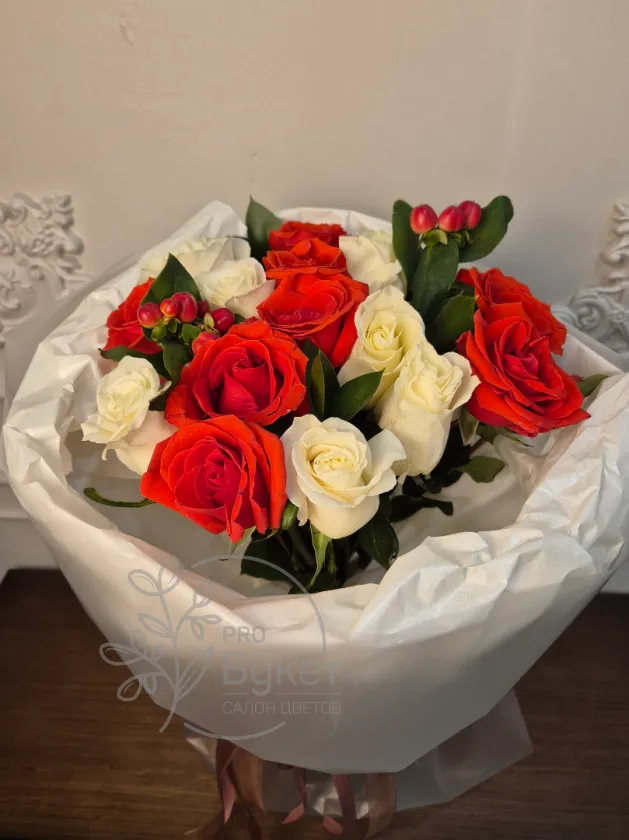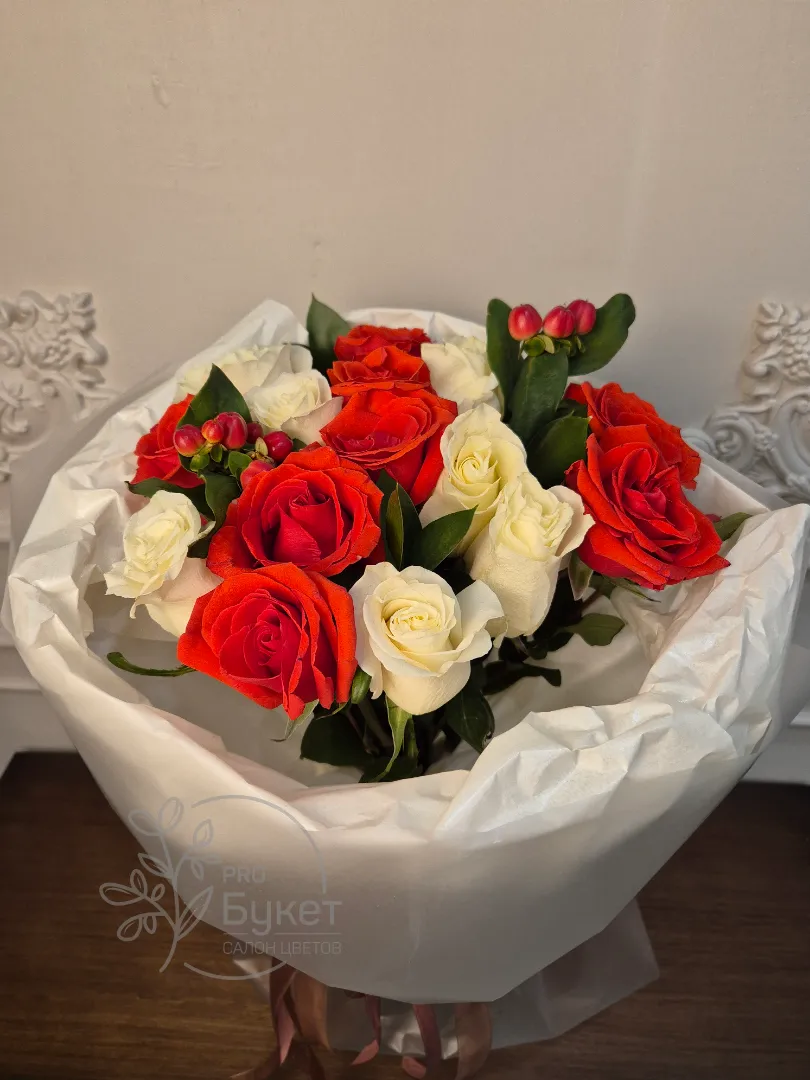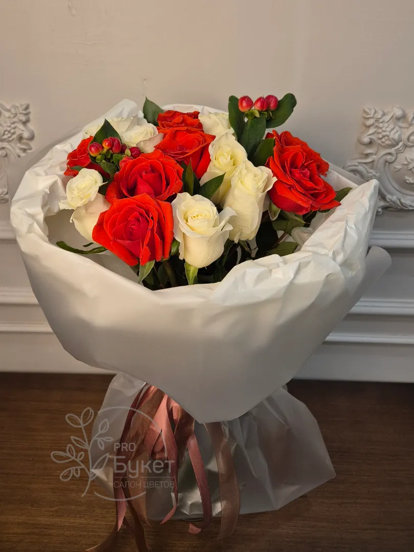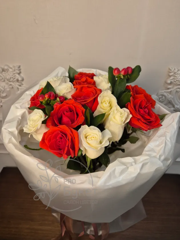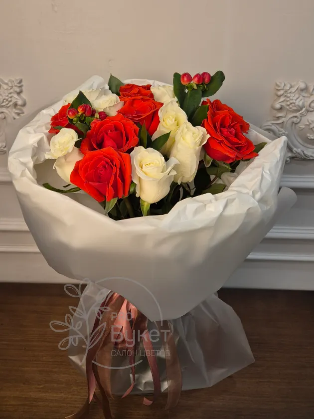 и ягодам гиперикума элегантно упакованный в белую бумагу. Сочетание ярких и нежных оттенков создает романтическое и праздничное настроение. Идеальный выбор для любого торжества или выражения искренних чувств.