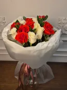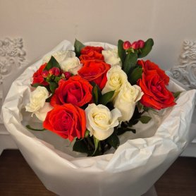 Букет из красно-оранжевых и белых роз, с