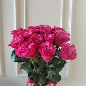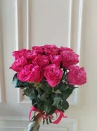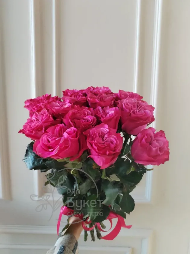 Букет из 11 роз яркого розового цвета, перевязанный атласной лентой.