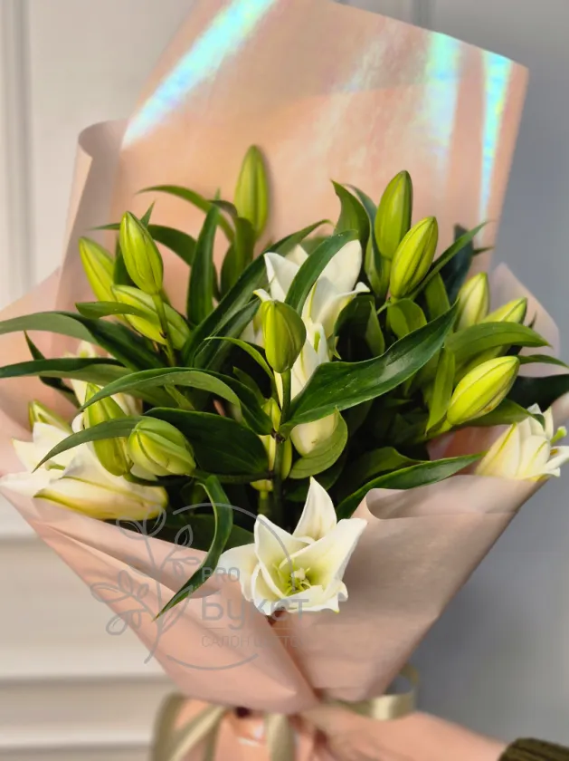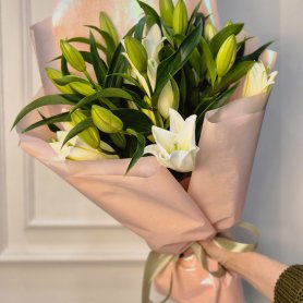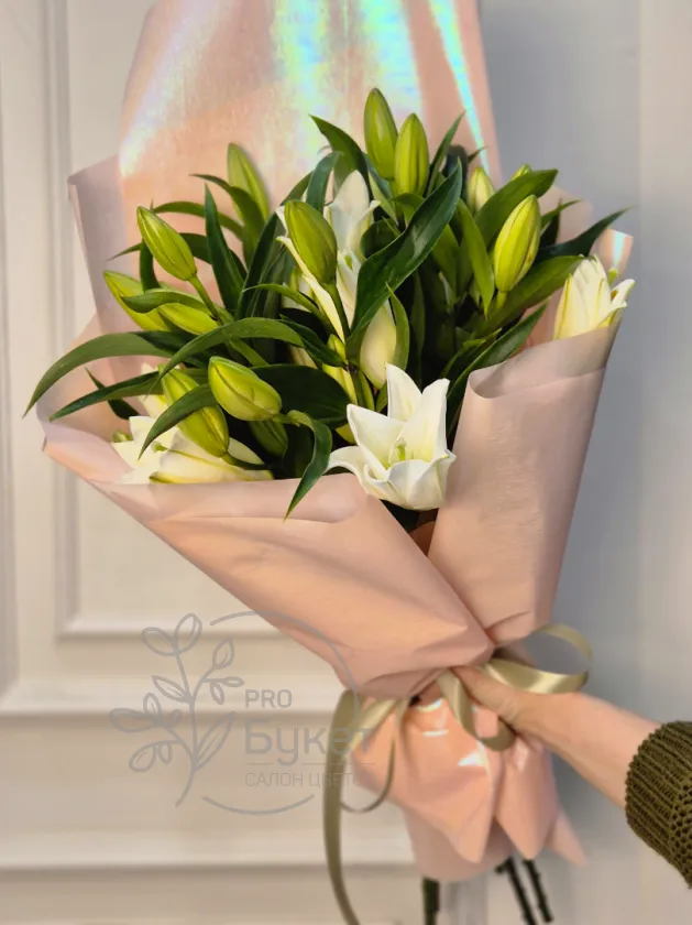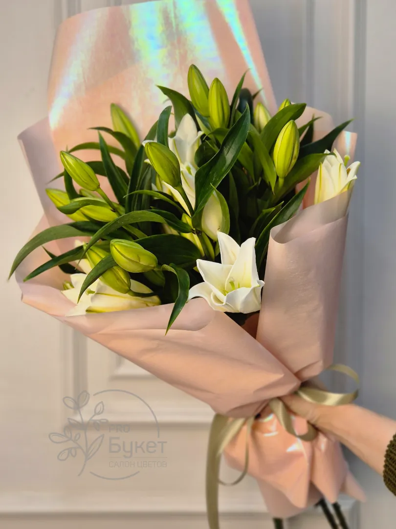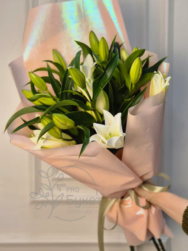 Букет из 5 веток лилий в нежно-розовой упаковке