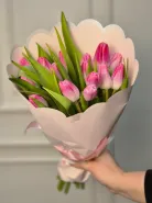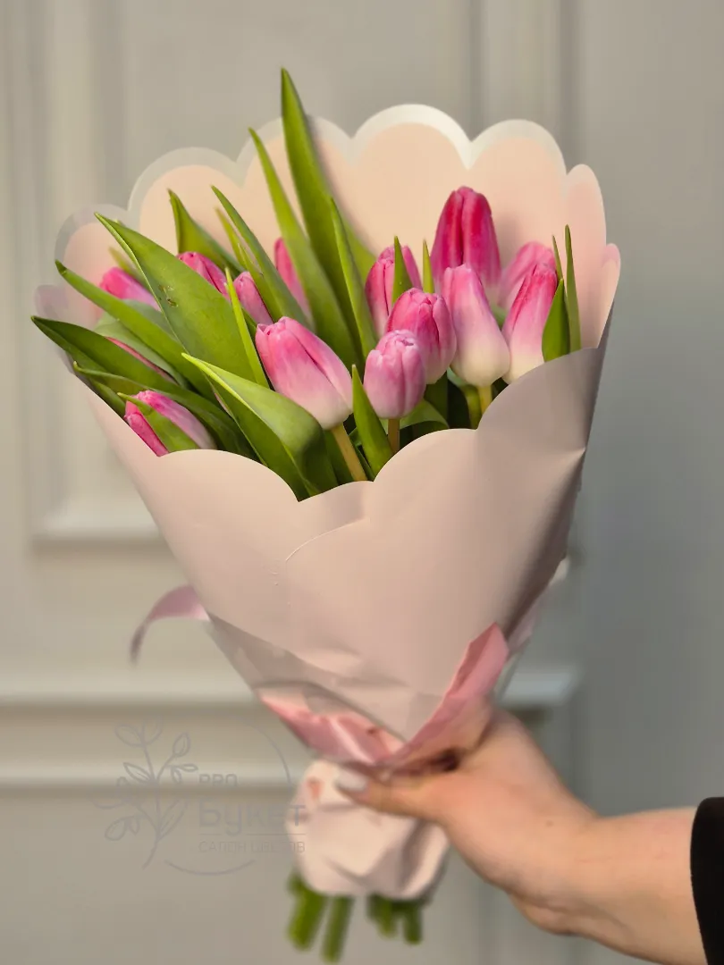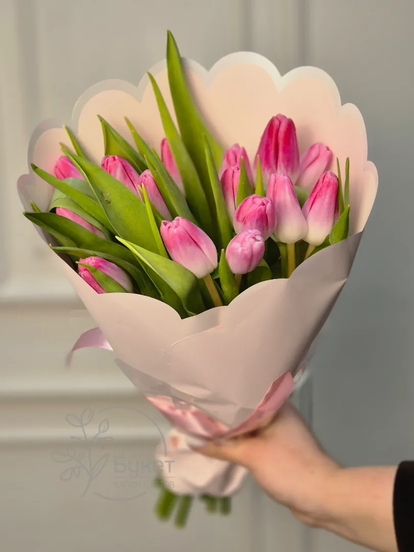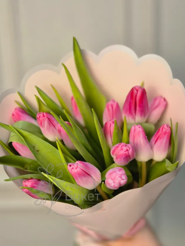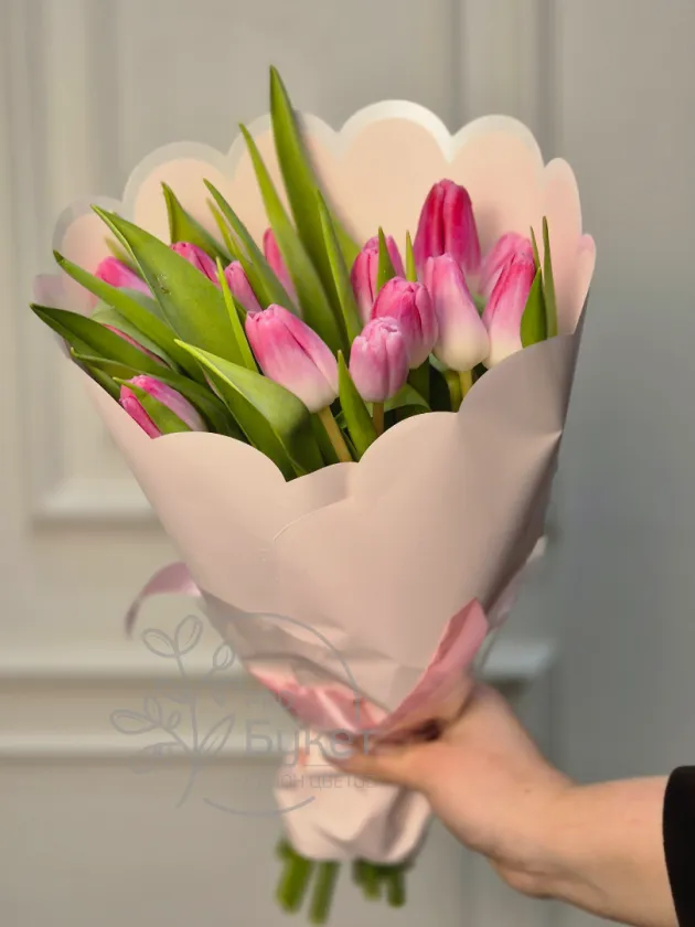 Нежный букет из розовых тюльпанов, завернутый в элегантную упаковку.