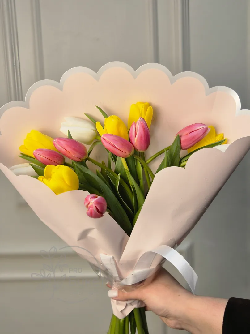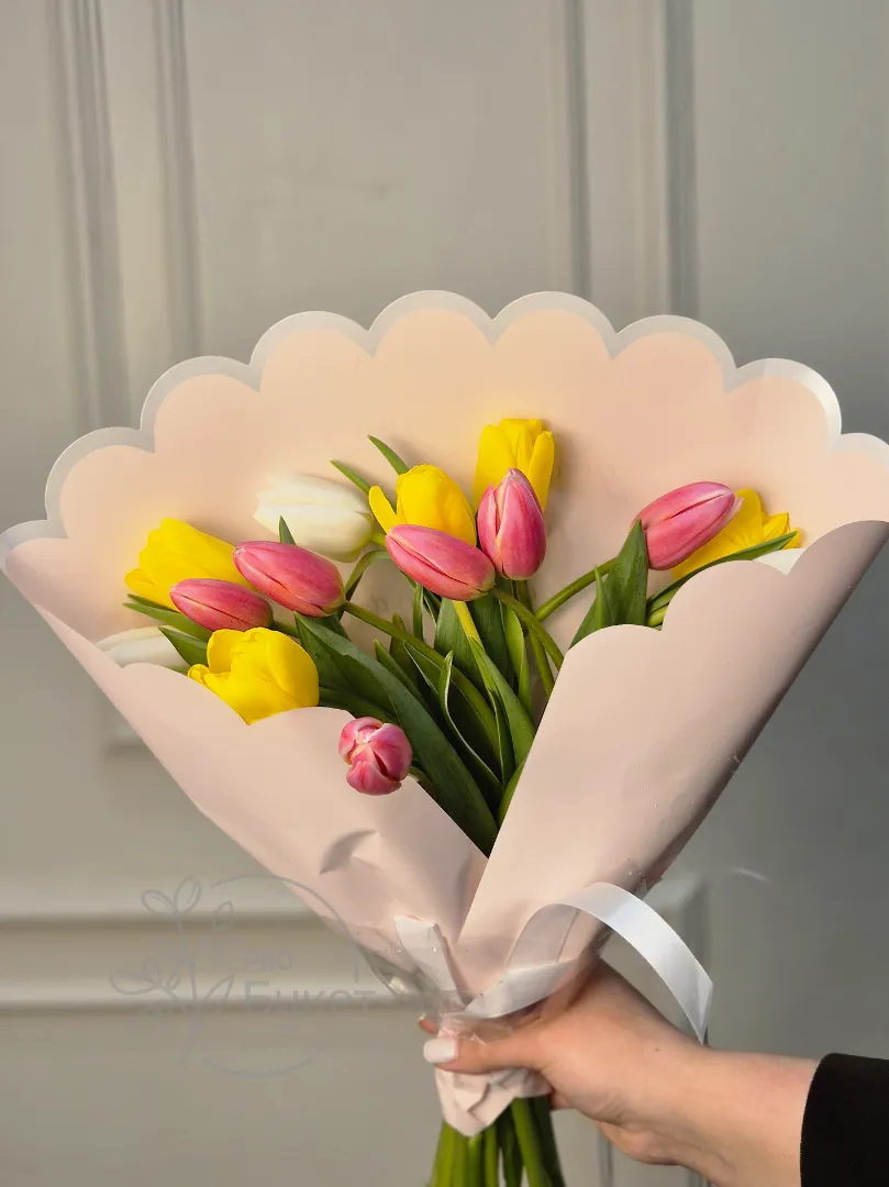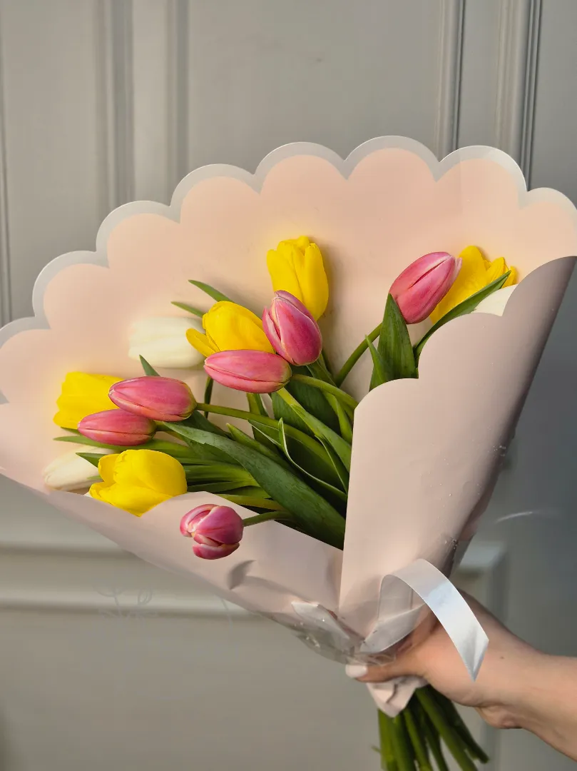 Букет из нежных тюльпанов белого, желтого и розового оттенков, элегантно упакованный в светло-бежевую бумагу с декоративным краем и атласной лентой, излучает тепло и радость.