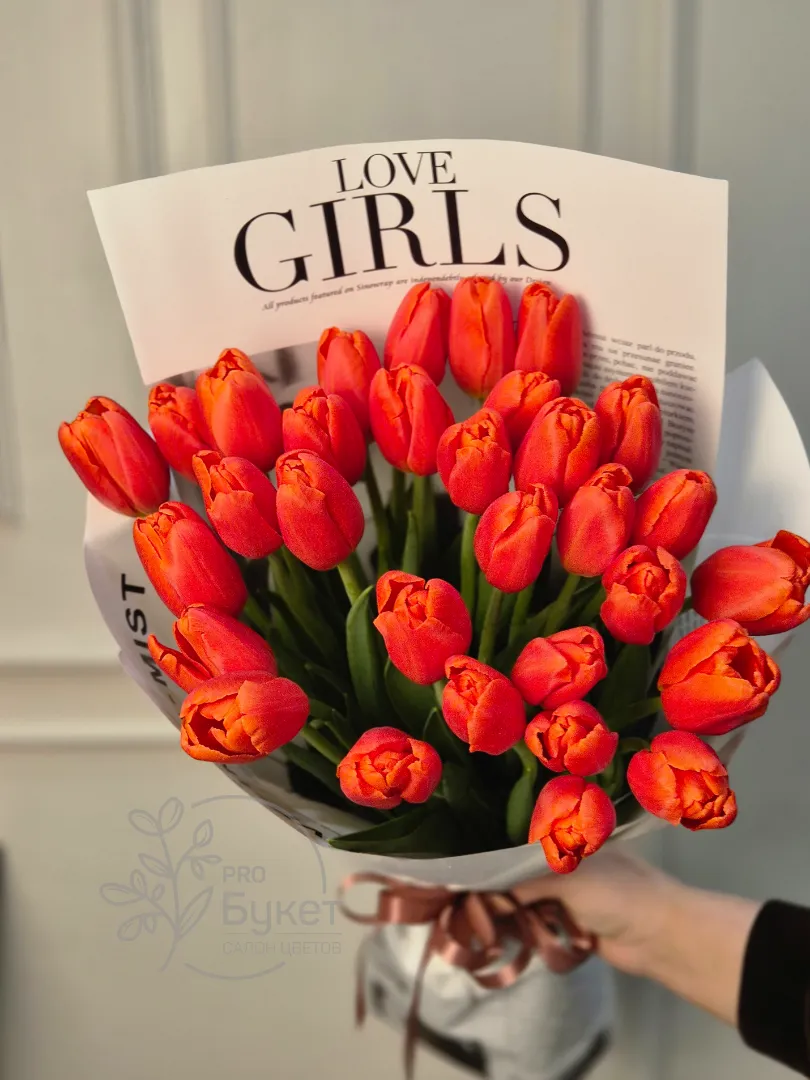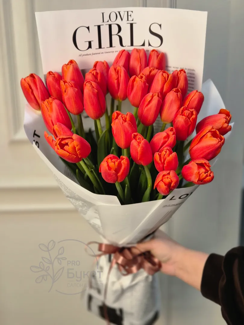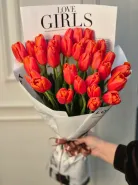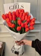 Любимые всеми тюльпаны в ярком коралловом оттенке, собранные в единый букет и красиво оформленные в белую бумагу с элегантными надписями, создадут праздничное настроение и точно не оставят никого равнодушным.