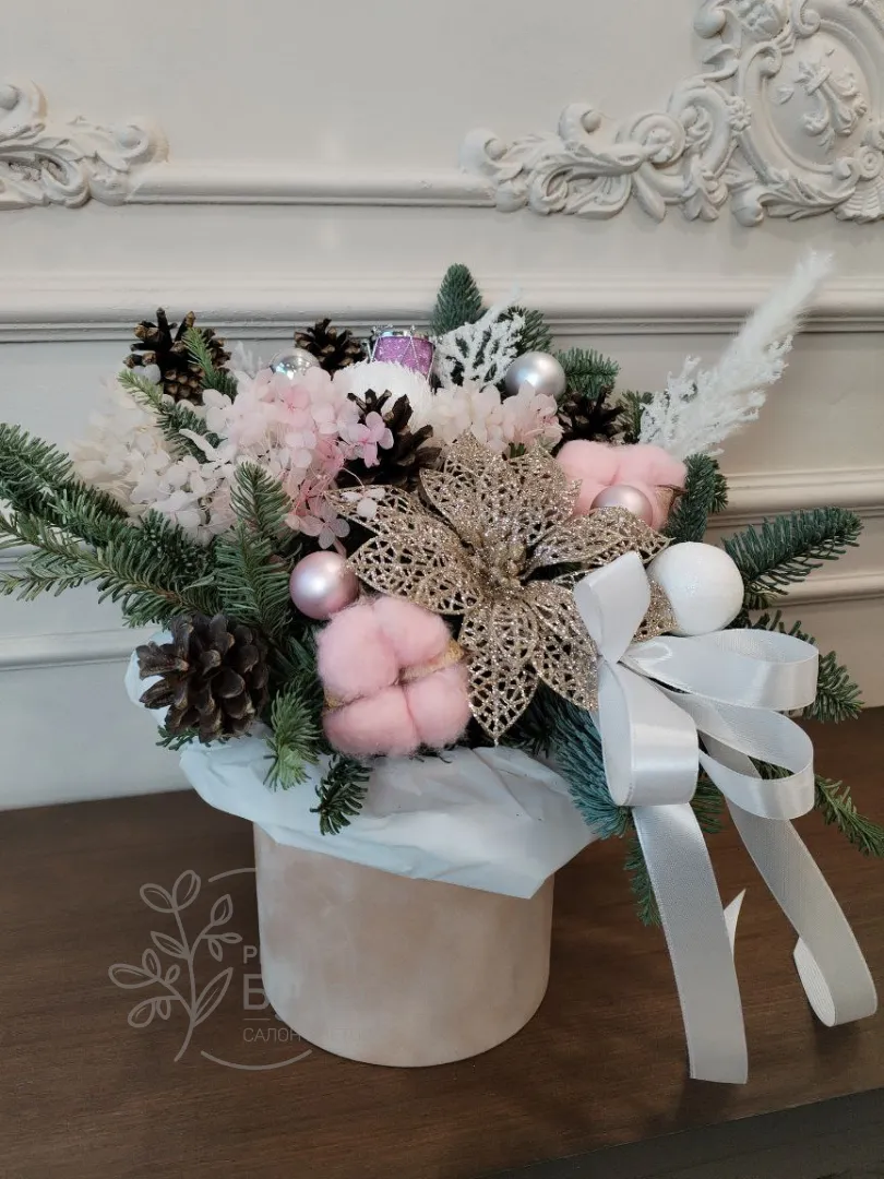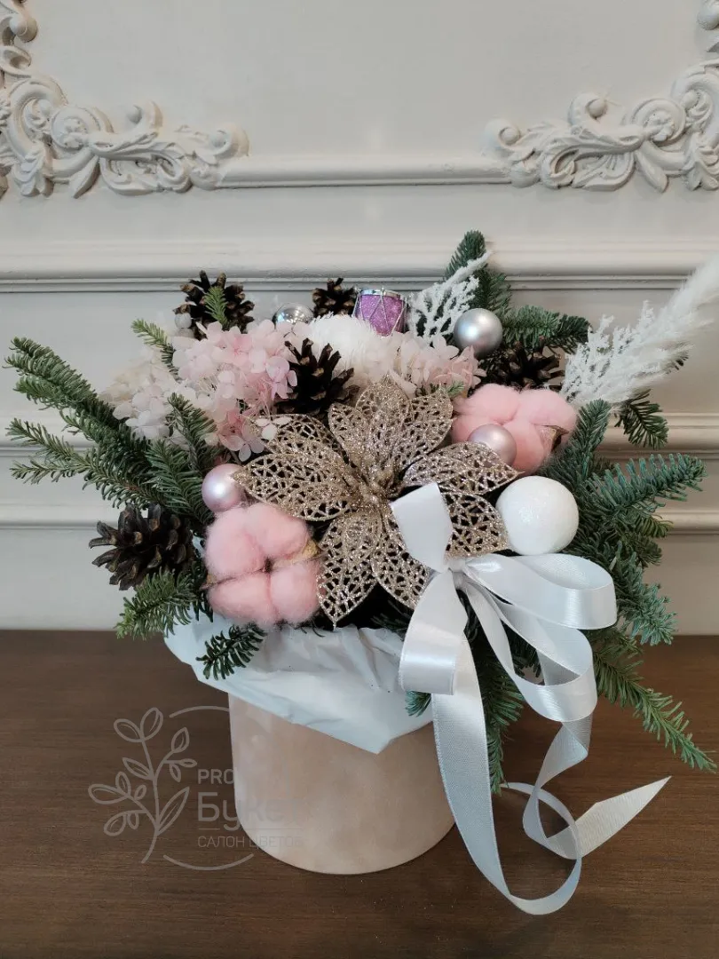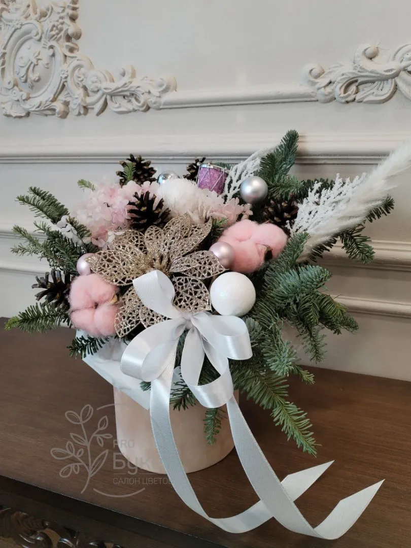 Пышная зимняя композиция в светлых тонах, украшенная блестящими акцентами и воздушной лентой. Нежные оттенки и натуральные элементы создают атмосферу уютного праздника. Букет станет прекрасным дополнением к любому зимнему торжеству.
