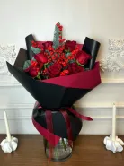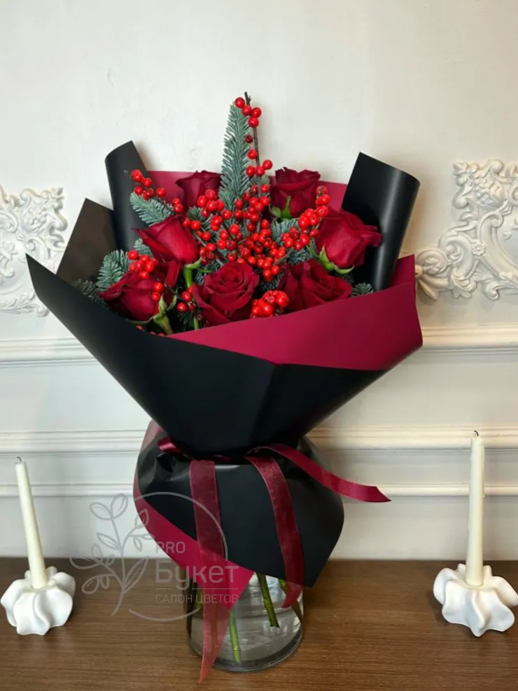 Букет, состоящий из темно-красных роз, дополненный веточками нобилиса и ягодами илекса, элегантно упакован в черную и бордовую бумагу с атласной лентой. Розы в сочетании с яркими ягодами и свежей хвоей создают эффектный и запоминающийся образ.